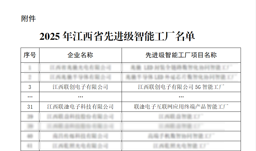 近日,江西省工业和信息化厅正式公布2025年江西省“先进级智能工厂”名单,186家企业入选。其中B体育在线,B体育(中国)、江西联淦电子科技有限公司2家联创电子系企业名列榜单。这标志着公司在智能制造领域的创新成果再次获得政府权威认可。
